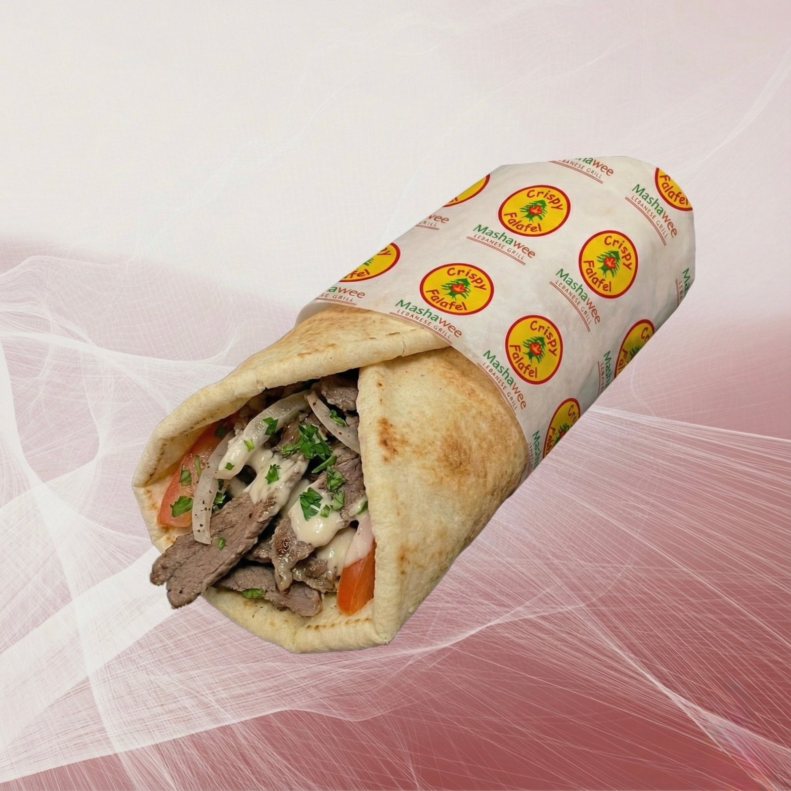 Lamb shawarma with hummus, parsley, tomatoes, onions, pickles, tahini. Hot sauce available upon request.